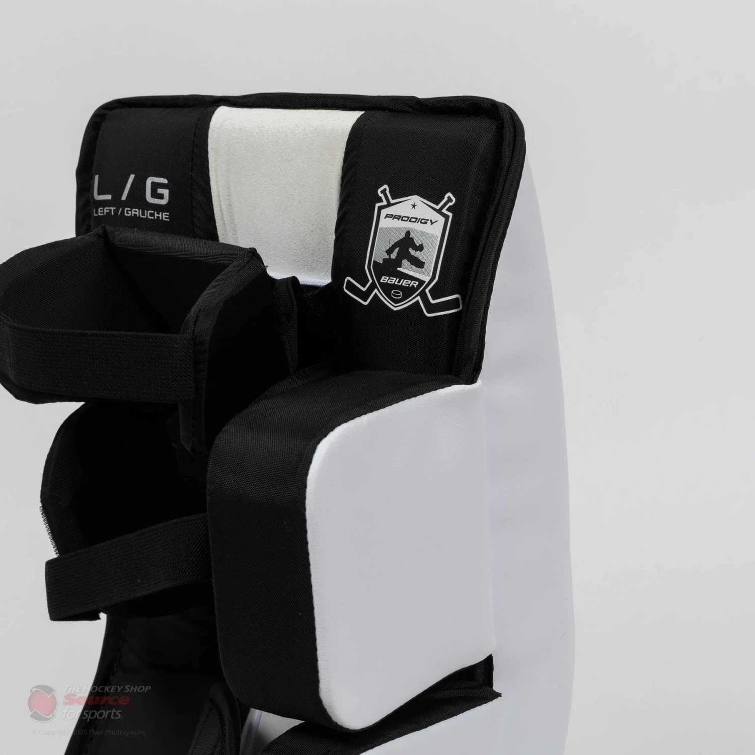 The GSX Prodigy leg pads come with built in knee guards on the pads to provide an extra level of protection, just in case a puck squeaks by the top of the pad. The padding attached to the leg pad can wrap around the leg using velcro.