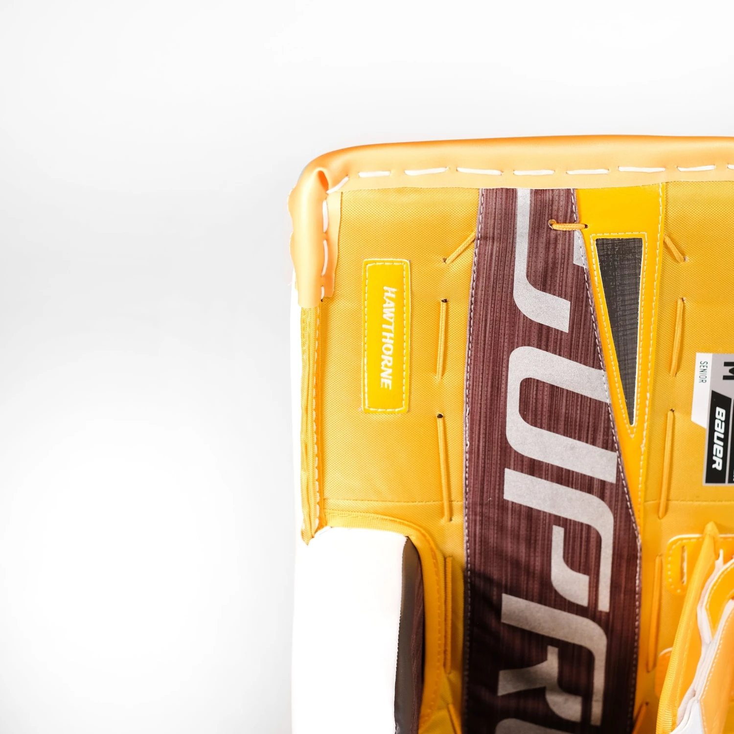 For the strapping, this custom gear includes no boot straps and skate lace toe ties. Over the calf, the pads’ calf wrap features stock calf wrapping. John Hawthorne opted for an elastic calf wing and plate for the pads.
