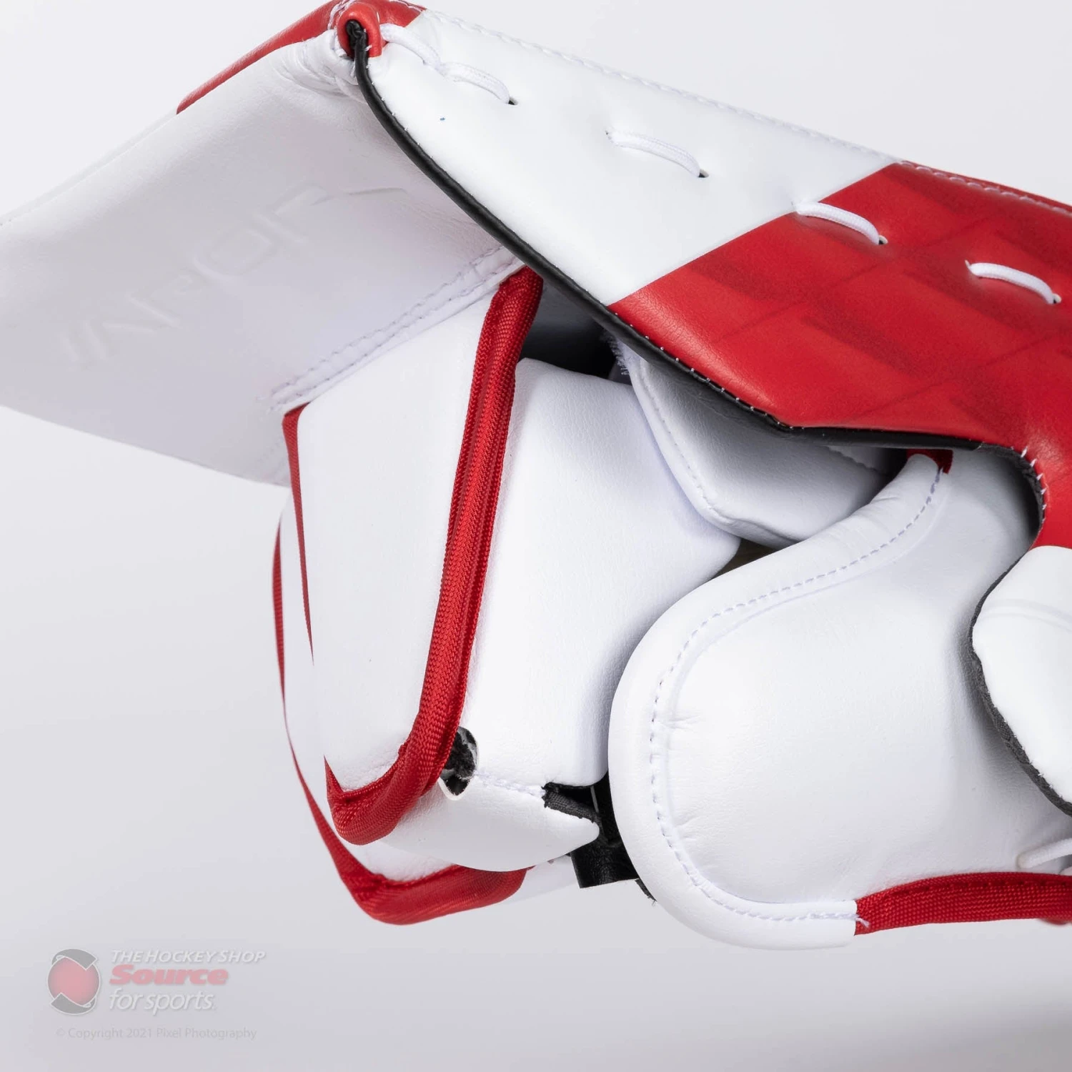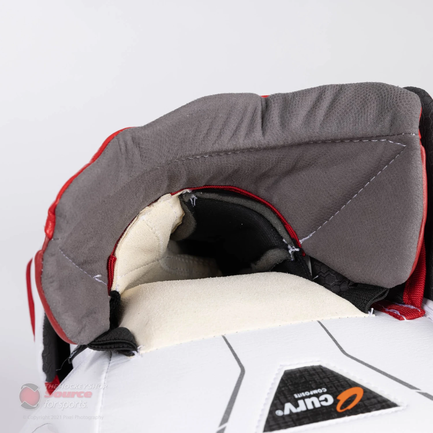 The back of the fingertips have foam added to them to give a bit of extra protection. Each finger with the exception of the index is individually velcro adjustable while the thumb protector uses a molded guard also lined with Poron along with a thumb pillow to absorb the impact of sidewall shots. A velcro removable pad is located by the index finger that helps to stop pucks from riding up the stick injuring the goalie’s hand.
