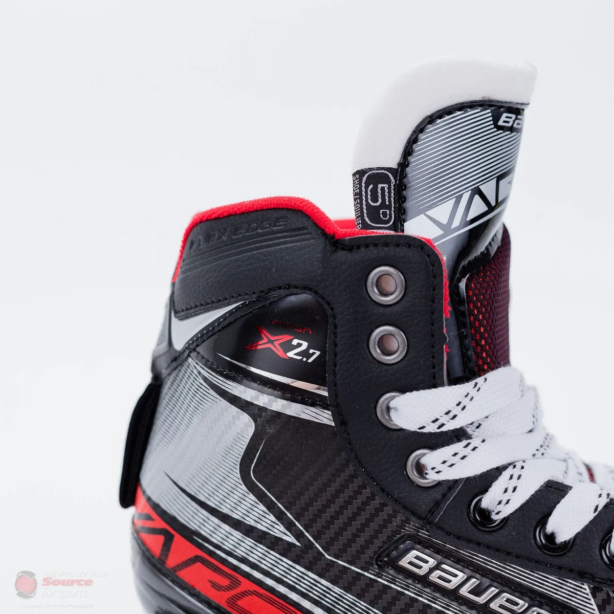 Sleek black and grey boot with red accents surround this skate to make sure you dont on perform well but you also look good while doing it. Sporting an X2.7 logo at the top of the ankle as well as a red stripe along the back of the foot that says Vapor. Lastly, the boot includes a red stripe near the toe cap to set it apart from the pro Vapor model.