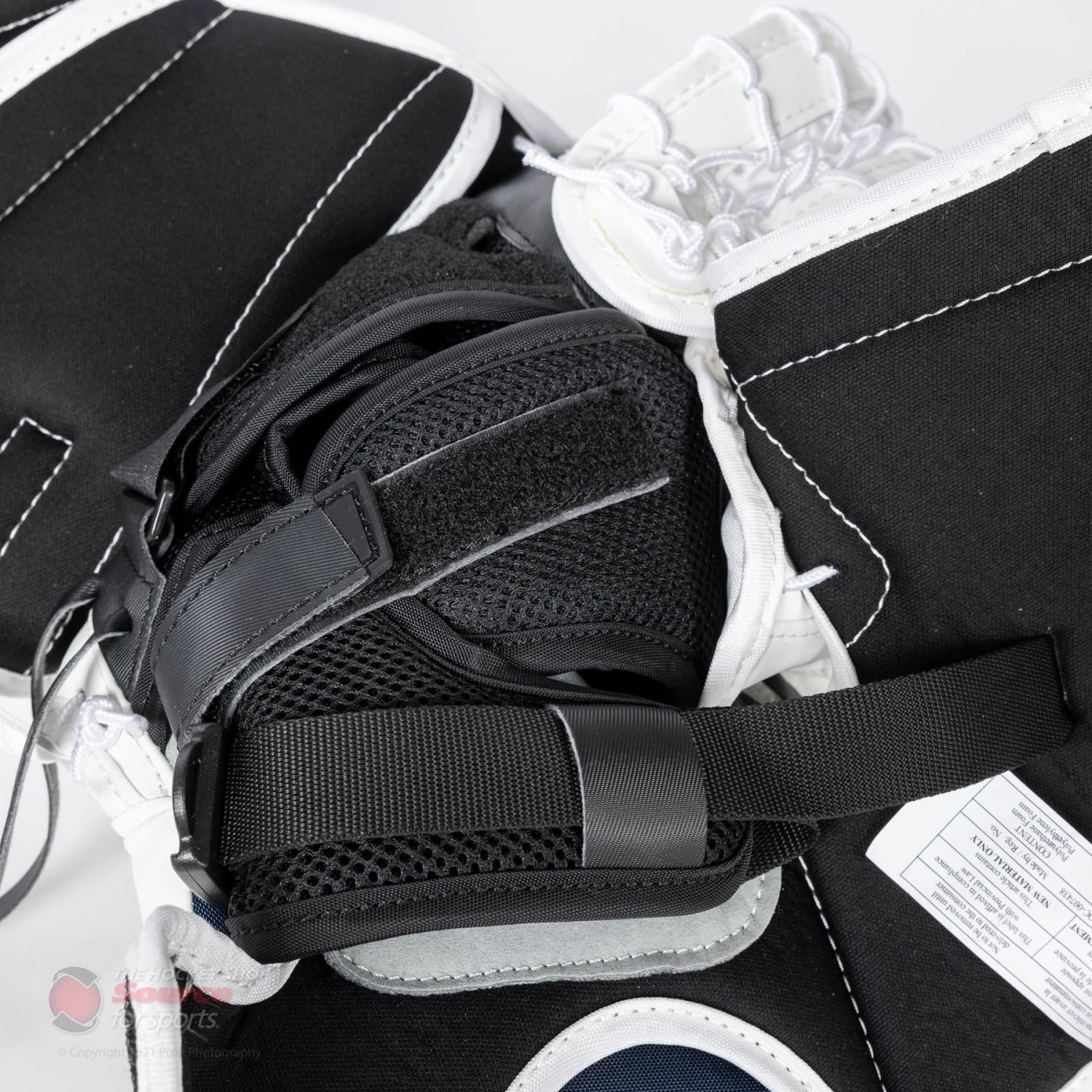 The back hand of the CCM E5.9 catch glove features velcro adjustments for the fingers, as well as the back of the hand. Goalies can also customize their fit by the quick release webbing strap on the wrist, which allows for easy and secure adjustment.