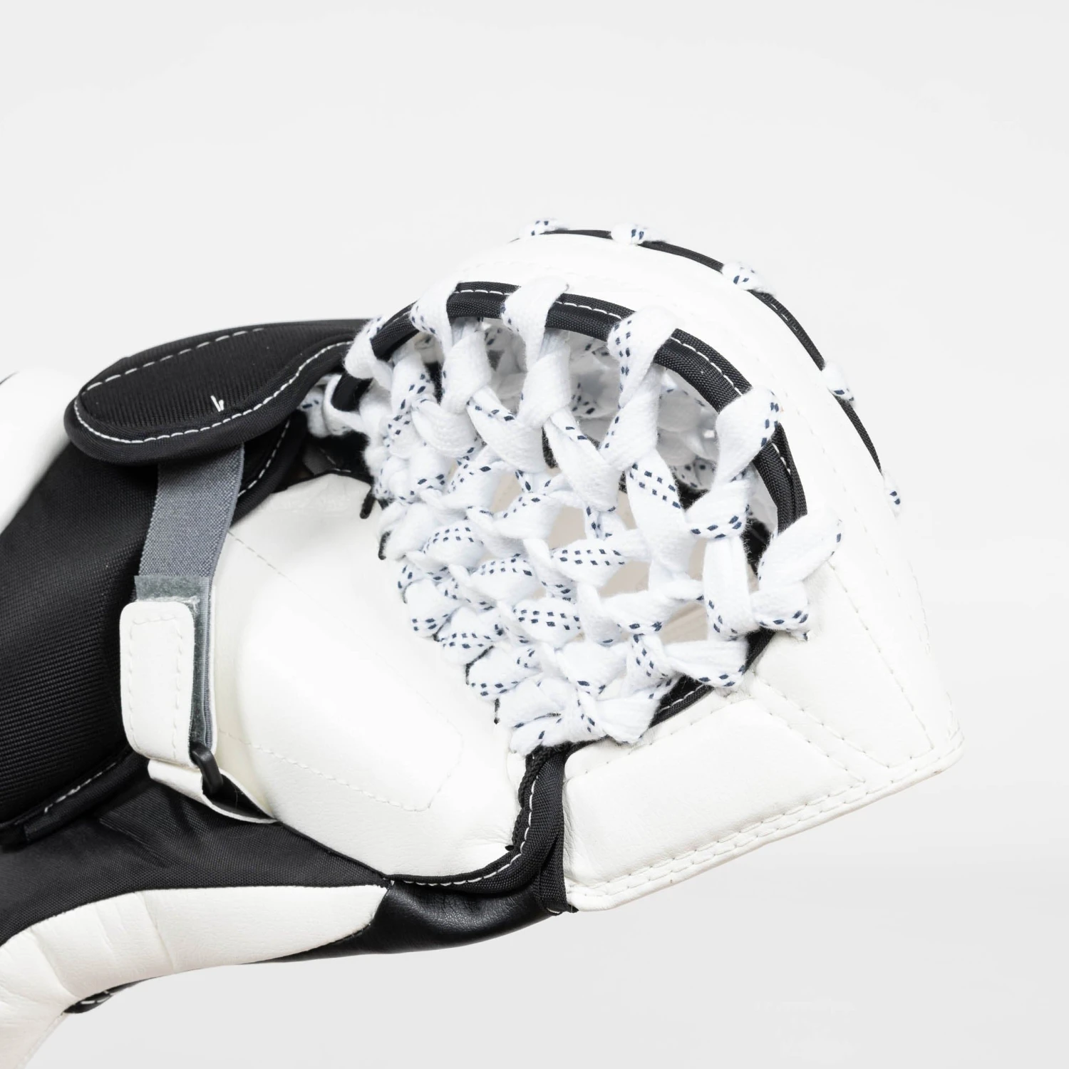 The pocket of the Junior size uses a single-T with a skate lace pocket. The closure has been made easier and quicker to close to accommodate younger, learning goalies to simplify making the saves.